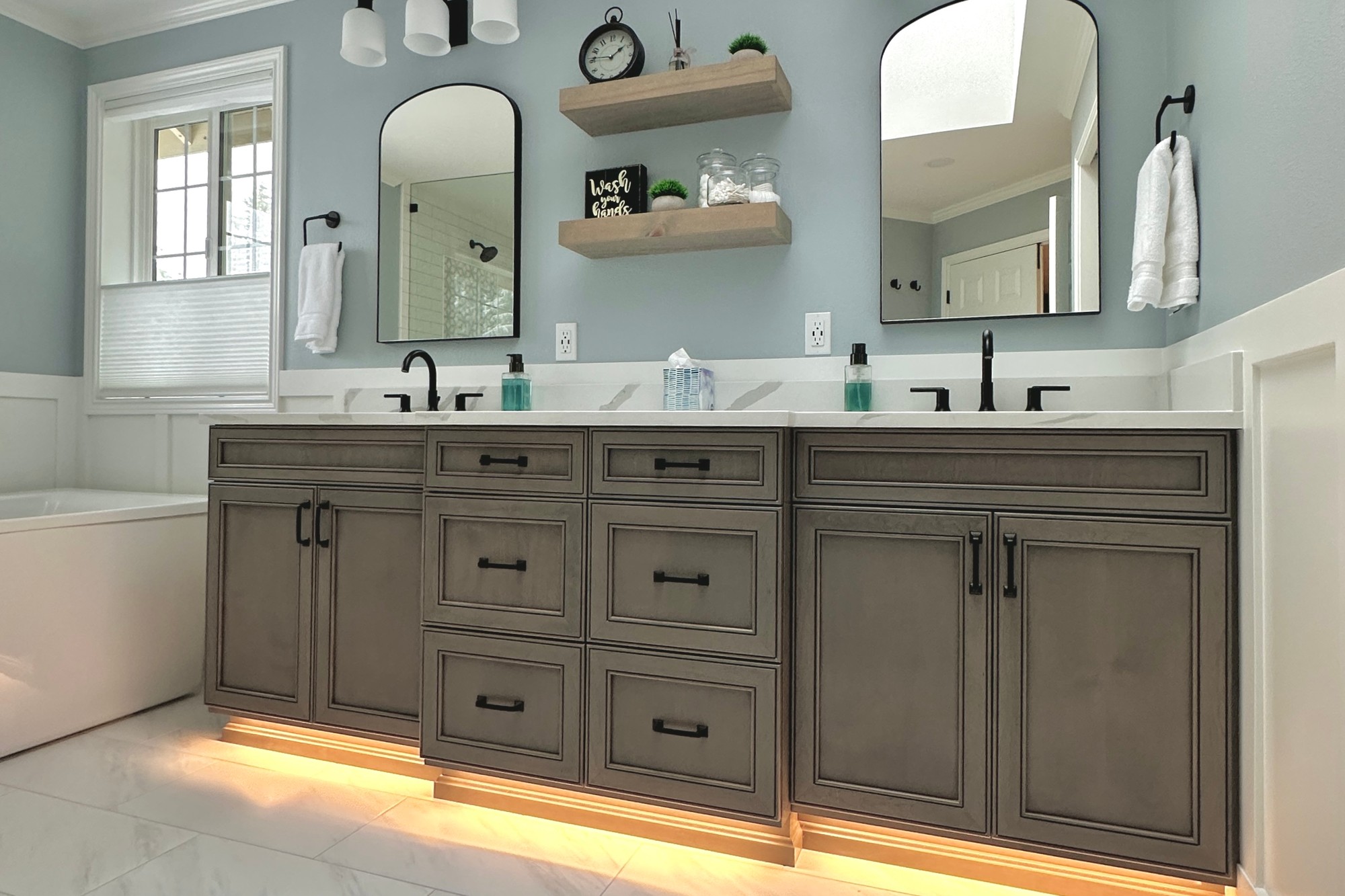 Custom vanities, vessel sinks, and modern fixtures sourced and installed by our team — no separate subcontractors involved.